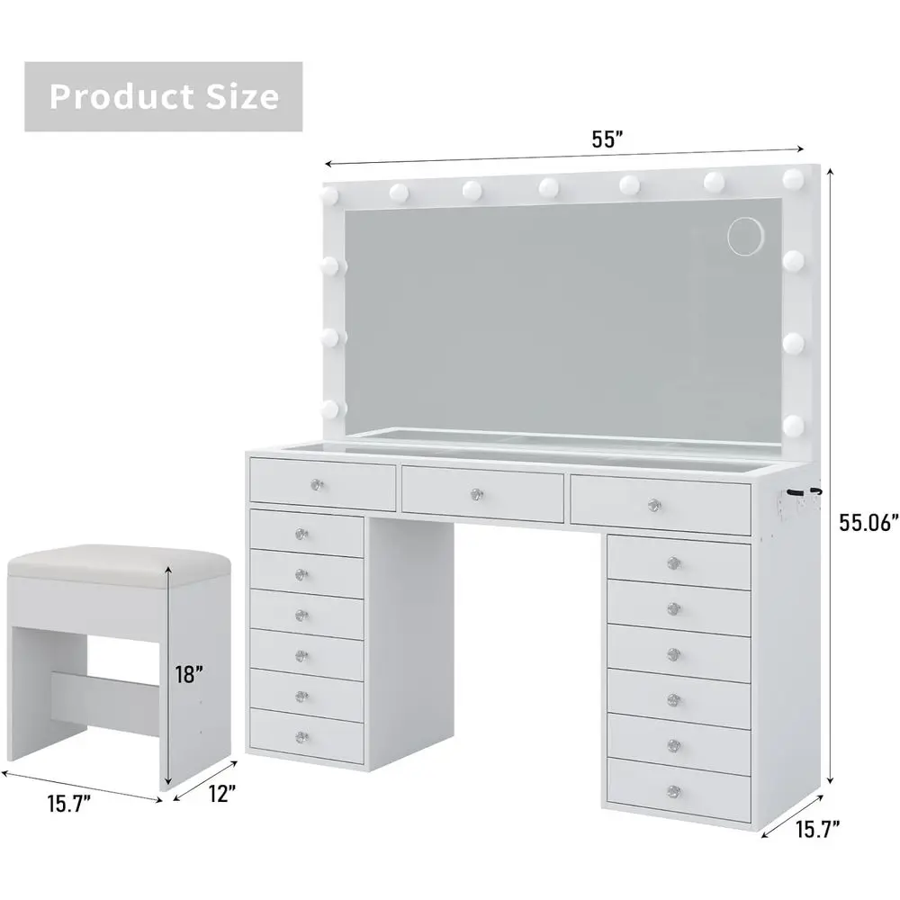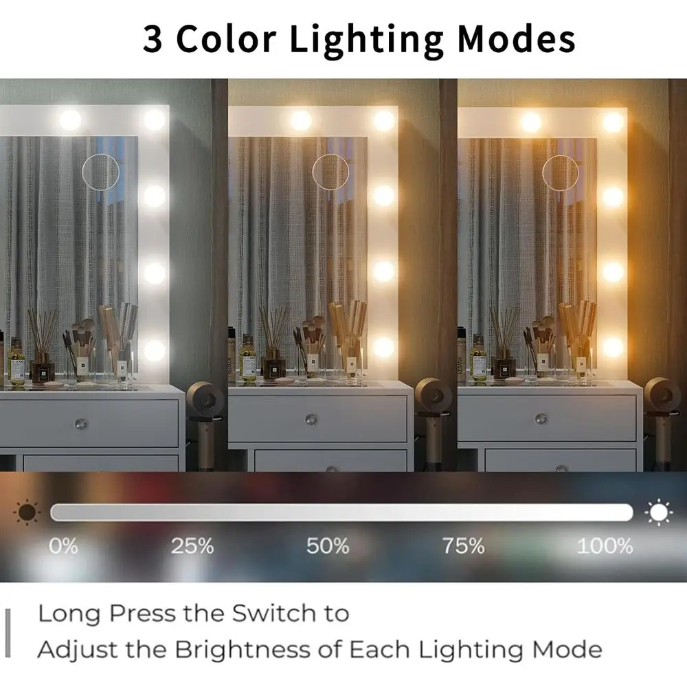 The vanity includes an HD mirror with 13 LED bulbs, offering 3 color settings (warm/natural/cool) to accommodate various makeup scenarios. The adjustable brightness simulates natural daylight and studio lighting, ensuring flawless makeup application under any condition while enhancing skin tone visibility.