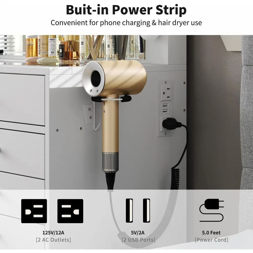 With 2 built-in electrical outlets and 2 USB ports, this vanity desk allows you to charge hair dryers, curling irons, phones, tablets, and laptops conveniently. It also includes a dedicated hair dryer holder for storage when not in use, keeping you powered up and content during your makeup or styling routine.