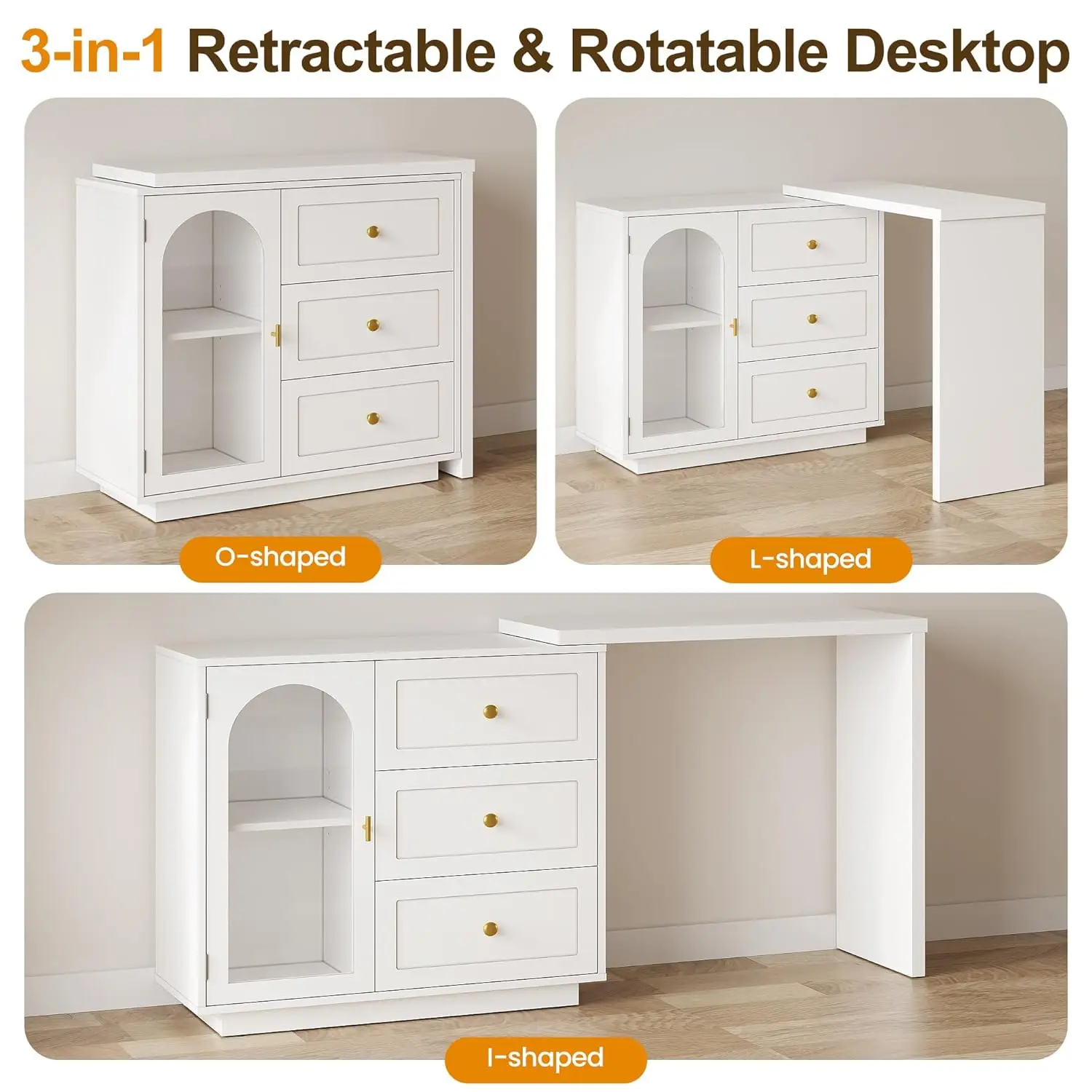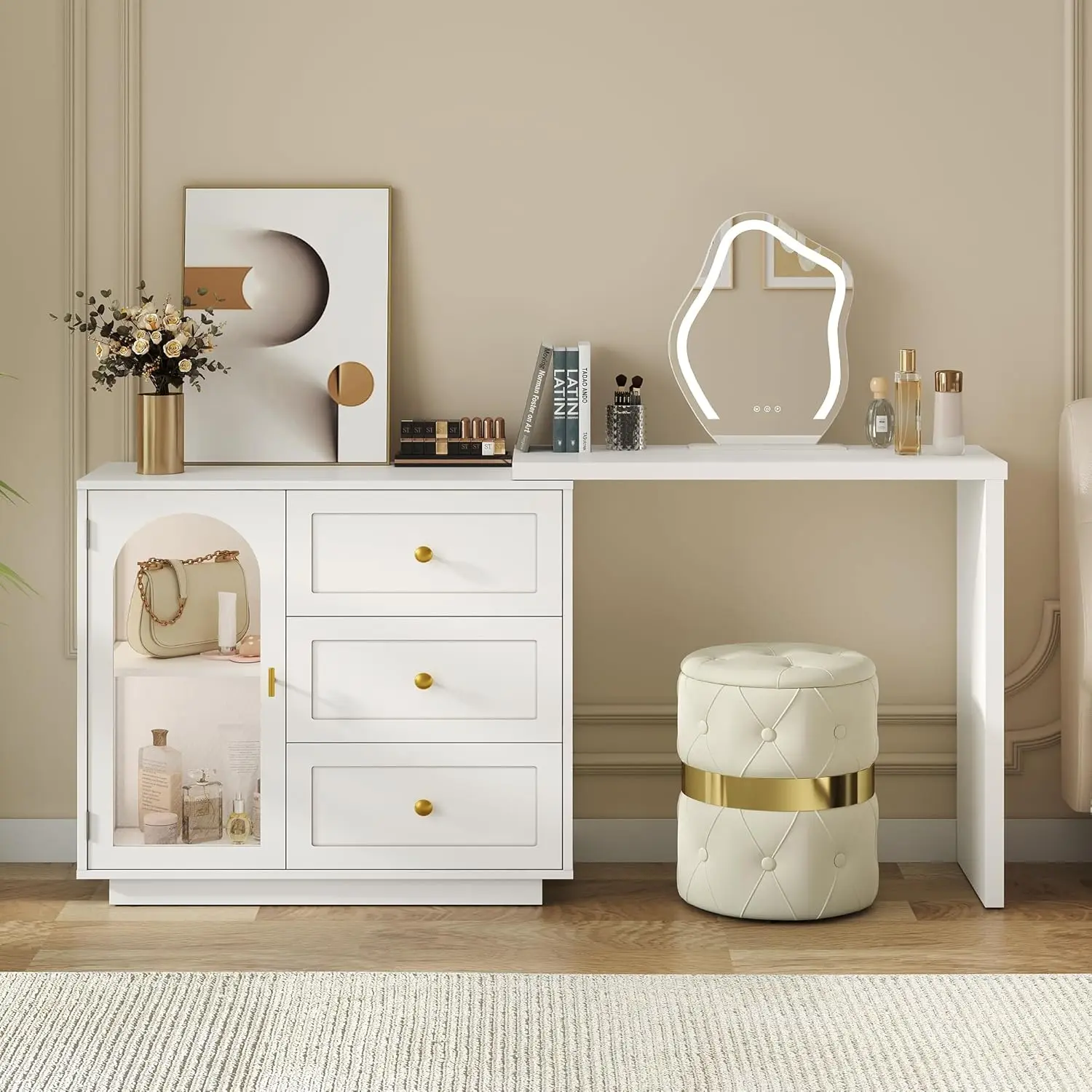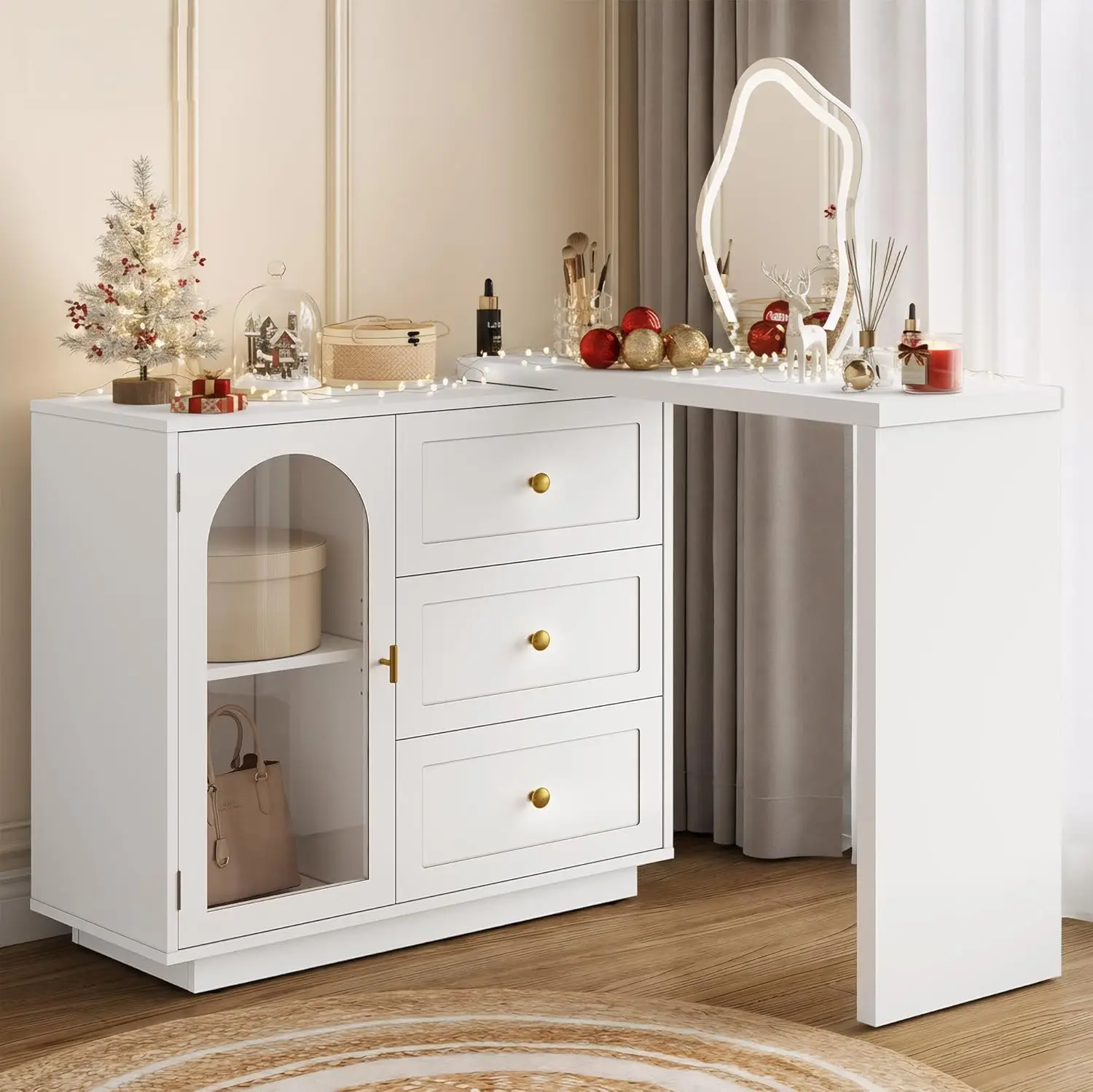 Versatile 3-in-1 Design: The L-shape layout maximizes the vanity’s size, ideal for placing at the foot of the bed as a bedroom TV stand or footboard cabinet. The L-shape layout is perfect for corner spaces, functioning as a writing desk or corner console. The O-shape option transforms the piece into a stylish chest of drawers or side cabinet, perfect for use as an entryway or sideboard cabinet. With this adaptable design, you can easily customize the layout to fit your home and lifestyle.