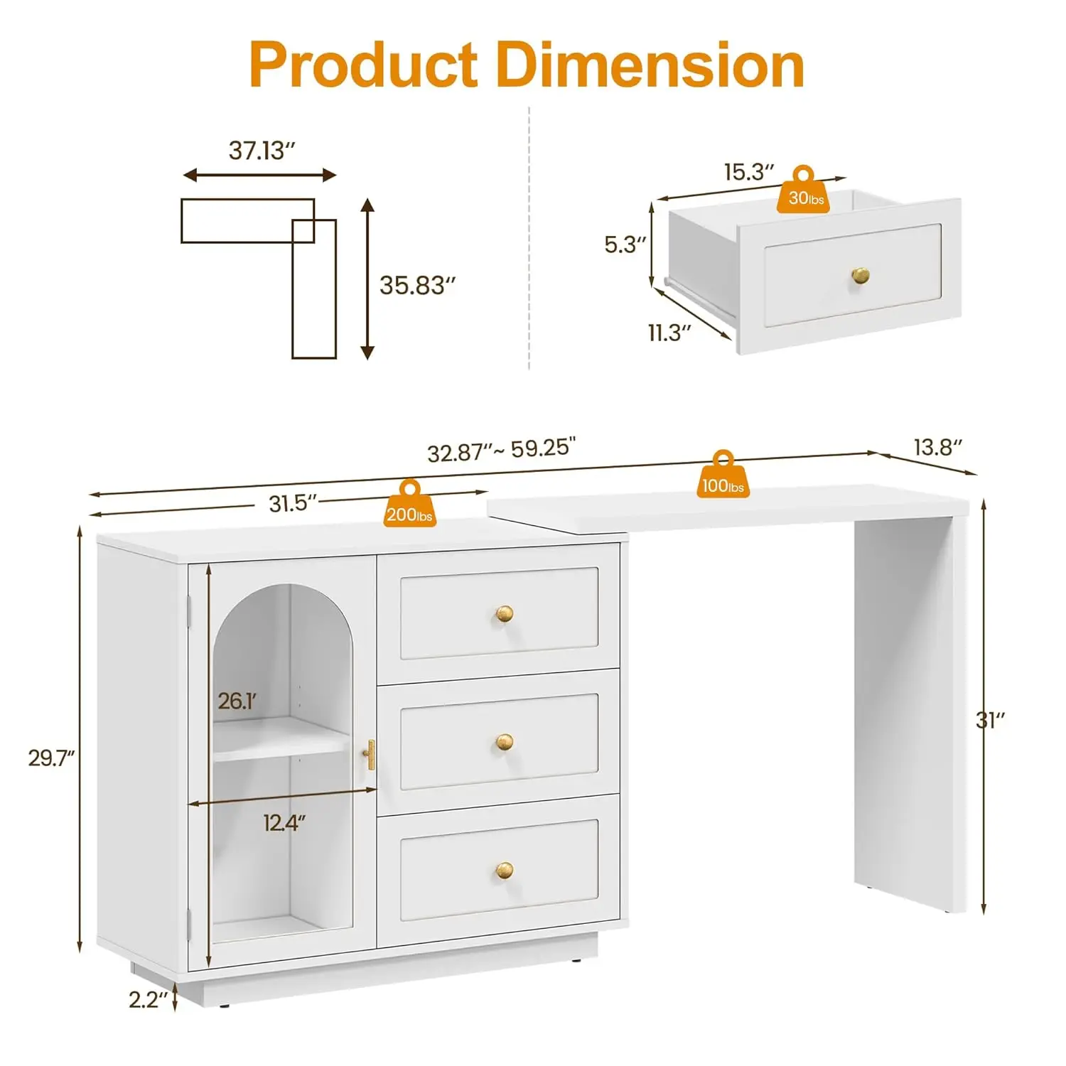 59” Extendable Vanity Desk:Measuring 59″W × 14″D × 30″H, this large 59″ vanity is ideal for homes, apartments, home offices, and dorm rooms. Its thoughtful design maximizes space while offering efficient organization and an elegant experience. We also offer an 83″ size option, perfectly suited for different spaces to meet your varying needs.