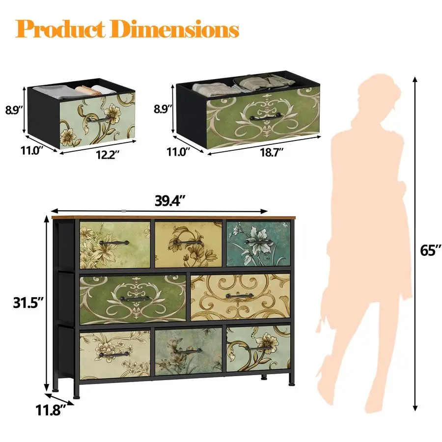 Multiscene ApplicationThe size of 8 drawer dresser 39.4 Lx 11.8 W x 31.5 H. It can be a storage dresser in the bedroom and living room or a great storage chest for closets, entryways, hallways, offices, playrooms and more.