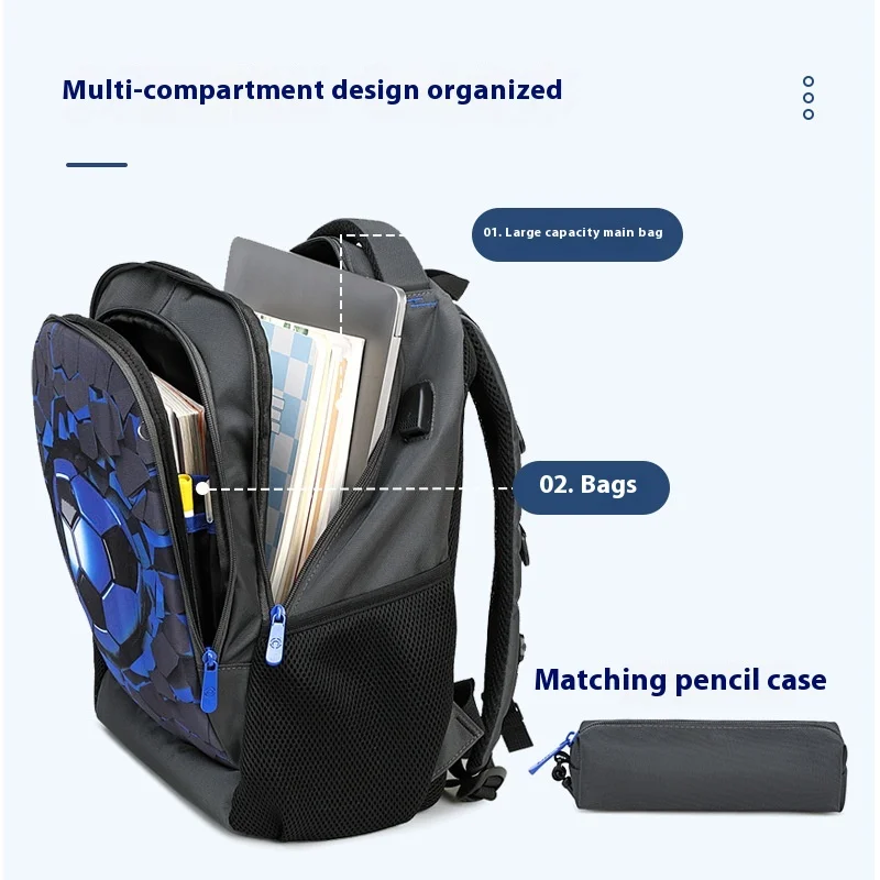 Boys Black Football Backpacks hard shell Orthopedic Middle School Student Book Bags USB Charge Multifunctional Bagpack