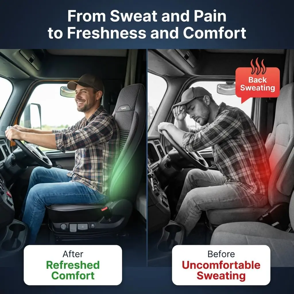 About This Product: Designed specifically for semi truck drivers who spend long hours on the road, this seat cover offers enhanced comfort and durability. It features a beaded cooling system that combines breathable mesh with natural wooden beads to improve airflow and reduce sweat buildup during extended drives. The ergonomic design helps distribute weight evenly, minimizing pressure points and providing reliable back support to alleviate discomfort on long-distance routes. Constructed with reinforced materials, it maintains its shape through daily use without flattening or sliding, ensuring lasting performance. Installation is quick and easy using metal hooks and secure clamps for a stable fit on most high-back semi truck seats. Compatible with various heavy-duty truck models, this universal cover is ideal for professional drivers seeking improved comfort and durability in their seating experience.