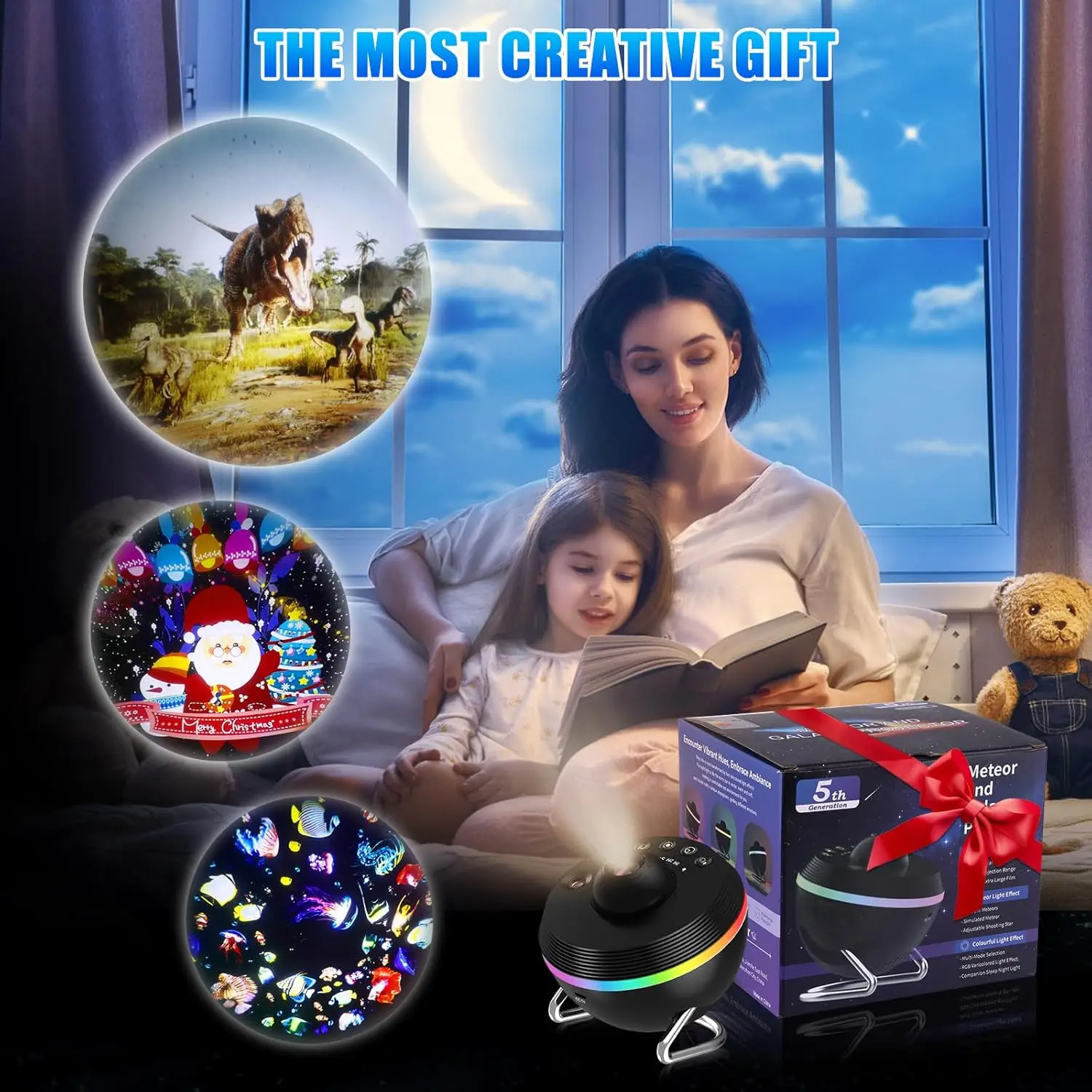 With our star projector, you will be able to enjoy 13 different themes of starry sky experience at home, including earth, solar system, the milky way, pillars of creation, black hole, bservable universe, NGC 6357, the orion nebula, dinosaur, marine organism, valentine's day, christmas, moon. Different starry sky every night turn your space into a mysterious planetarium, immersing you in the charm of the endless universe.