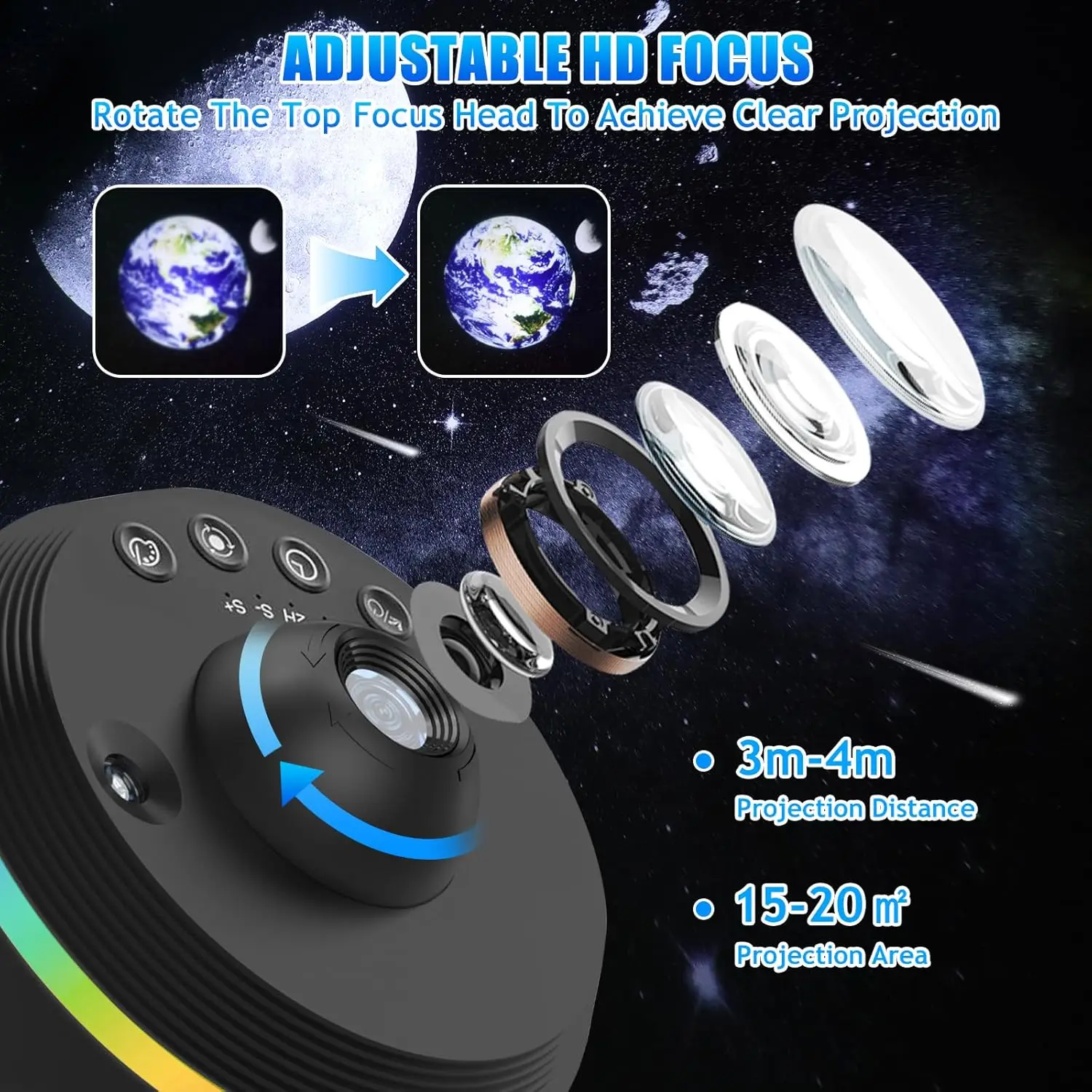 ����【Upgraded Lens, Enjoy True HD Starry Sky Experience】 Galaxy star projector has a built-in HD optical lens that can project clear high-resolution images. The upgraded optical lens design achieves a 1-fold increase in brightness. Equipped with a rotary focus knob, it achieves HD projection with max projection distance of 2-3m & area range of 7-16㎡, which is enough to fully cover the ceiling, wall or floor. You will feel the shocking visual effects of the starry sky in a clearer picture.
