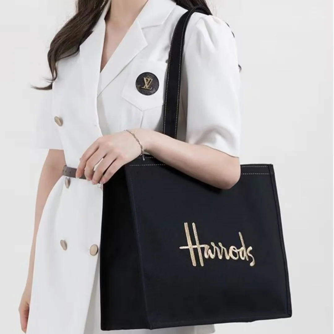 Harrods Canvas Handbag Embroidered Letters Shoulder Bag Cartoon Girl Shopping Bento Bag