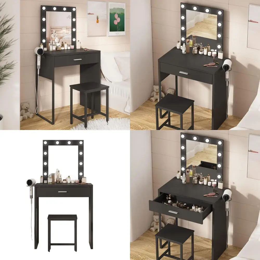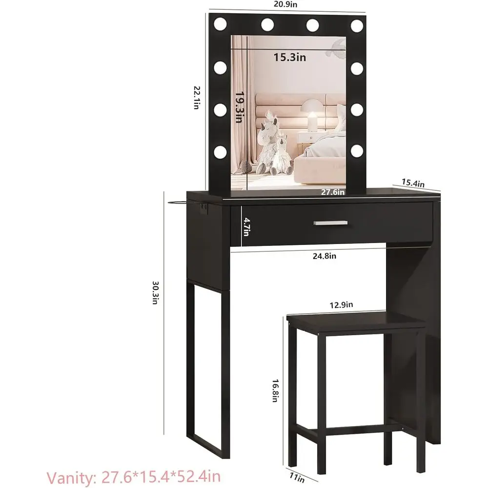 Makeup Vanity Desk with Mirror and Lights, Black Table and Chair Set, Adjustable, Small Vanity for Girls’ Bedroom