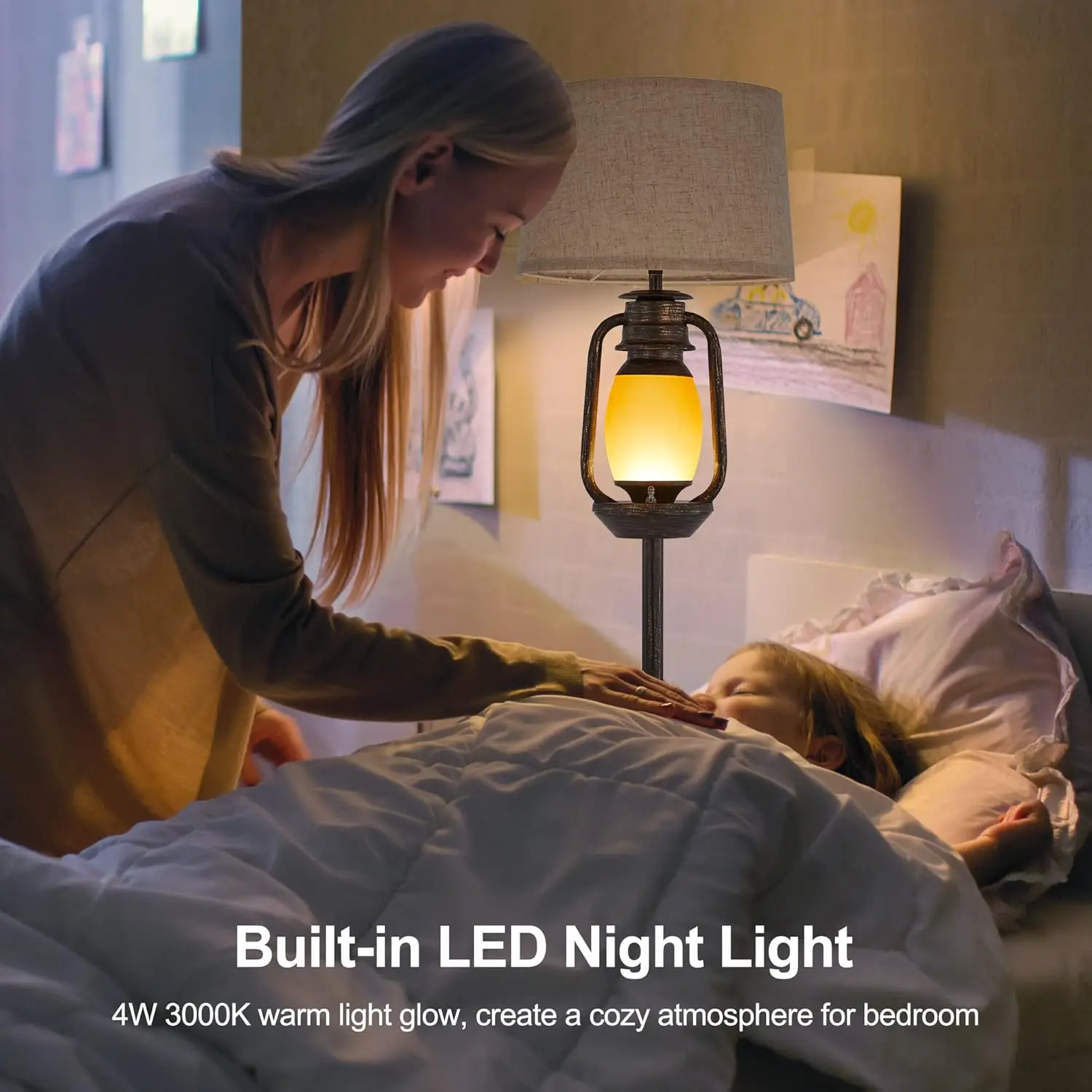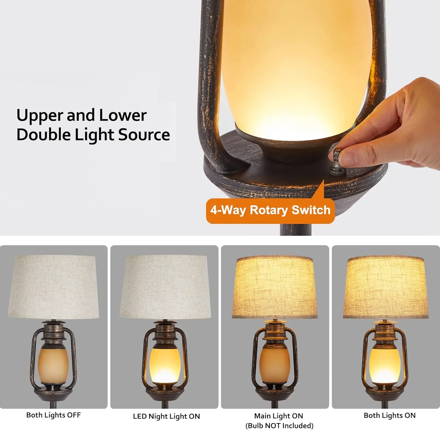 Rustic Farmhouse Floor Lamp with Night Light, Beige Linen Shade, Bronze Finish for Living Room Bedroom Decor