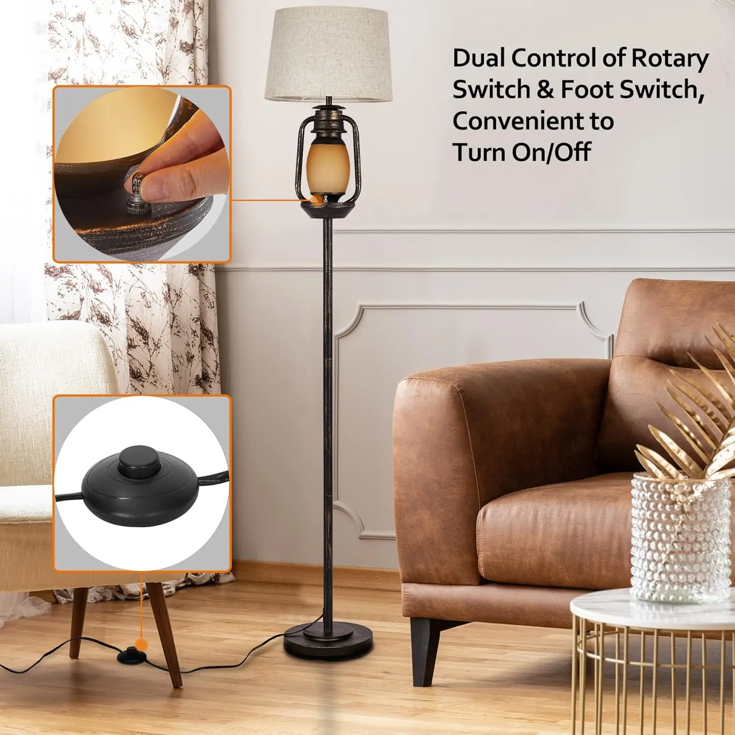 【Dual Lighting Design】This rustic floor lamp features two light sources: a main overhead light and a built-in lantern-style night light. The upper light uses an E26 socket (bulb not included, max 60W) for adjustable brightness, while the lower night light has a fixed 4W 3000K LED that emits a warm, soothing glow perfect for bedtime. You can choose between four lighting modes—upper only, lower only, both on, or both off—via a convenient rotary switch on the base. 【Stylish and Versatile Aesthetic】Crafted with an oil-rubbed bronze finish and a natural beige linen drum shade, this lamp blends farmhouse charm with industrial elegance. Its traditional yet transitional design complements various decor styles, including retro-modern, classic, and medieval themes. The neutral color palette ensures it fits seamlessly into living rooms, bedrooms, guest rooms, or narrow corners without clashing with existing furniture. 【Convenient and User-Friendly Features】Enjoy effortless control with both a rotary switch on the lamp base and a foot-activated master switch. The foot switch allows you to turn the lamp on or off easily from your sofa or bed without bending over. Assembly is simple and tool-free—just screw the pole sections together—and the heavy-weighted metal base provides stability to prevent tipping around children or pets. 【Energy-Efficient and Durable Construction】The integrated LED night light is designed to last longer while using less energy compared to traditional bulbs. It eliminates the need for frequent bulb replacements in the lower section. Made from sturdy materials, this floor lamp is built to withstand daily use while maintaining its elegant appearance over time. 【Space-Saving and Functional Design】With its tall yet slim profile, this standing lamp saves space in tight areas like beside sofas or in room corners. The beige linen shade diffuses light softly to reduce glare and eye strain during reading or relaxing hours. Whether used as ambient lighting in your living area or as a gentle nightlight in the bedroom.