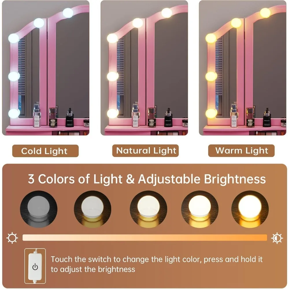 【10 LIGHT BULBS & 3 COLOR LIGHTING MODES】Vintage Yet Stylish, classic Tri-Folding Mirror with 10 Hollywood Style LED Bulbs. There are 3 lighting modes, touch the switch to adjust the modes: ①Warm Yellow – Suit for Night Makeup. ②Warm White – Suit for Indoor Makeup. ③Cold White – Suit for Daily Makeup. Allowing you to makeup in a variety of light conditions with soft and not dazzling light, it’s also a perfect place for yourself to escape and unwind after a long day.