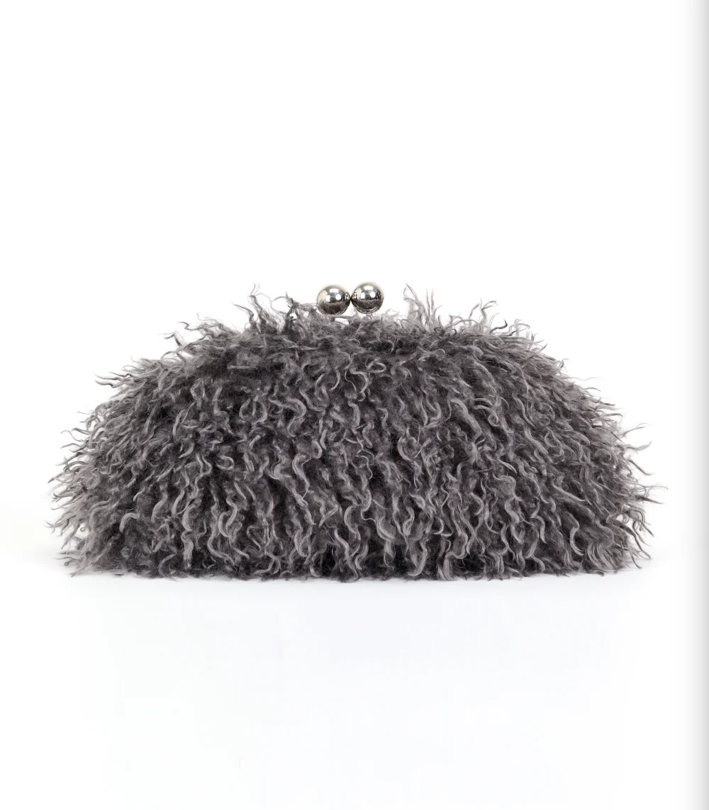 Women kisslock Faux Fur Clutch bag winter warm dark grey pouch frame clasp bag with chain crossbody